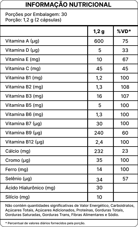 Sua fórmula reúne vitaminas e minerais essenciais que atuam de dentro para fora, proporcionando cabelos mais fortes, pele com mais firmeza e unhas resistentes.